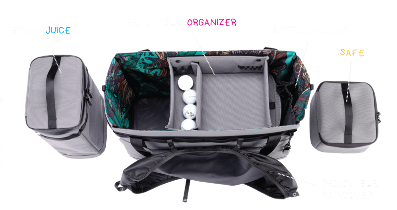 The optional Birdie Juice Cooler ($50), made of recycled PET, fits inside the tote to hold beverages. A bottle holder, a separate large space for balls, gloves, phones and other items, along with an optional safe ($30) and rain cover complete the package.