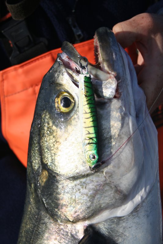 Blues may show up at any time. Keep a couple of metal lures handy just in case.