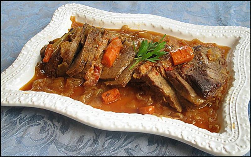 The one commonality (except for Grandma Blanche) is the cooking process: long and slow, which translates to several hours in a low-temperature oven. Often, this includes an overnight rest in the refrigerator before the final round of heat, and the meat is usually sliced before this last period of cooking, rather than at the table. The reason is that the partly cooked and chilled brisket is easier to slice cold and less likely to fall apart, as it does when completely cooked.