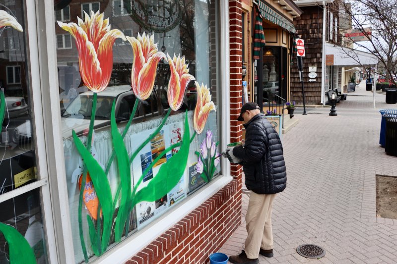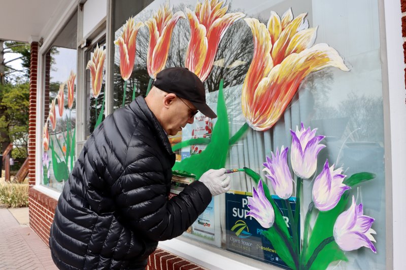 It has become a rite of spring on Second Street in Lewes. Artist Alex Badialov paints tulips on the windows at R&L Liquors to welcome visitors to the city’s annual Tulip Festival, which kicks off April 1. Badialov said he has been painting a different design at R&L for about 15 years.