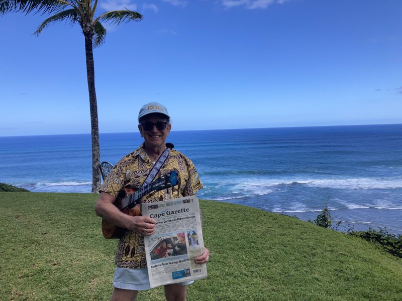 March brought Robb—aka Roo on Uke—back to the islands for the fourth Ukulele Retreat Hawai’i. It was a week of strumming, swimming, and soaking in the aloha spirit. After spending time on Oʻahu, he ventured to Kauaʻi, where music and ocean breezes met in perfect harmony. Between dips in the Pacific and jam sessions under palm trees, Robb filmed five Hawaiian music videos, now featured on his YouTube channel. And while the waves rolled in, he stayed connected to home by flipping through the Cape Gazette. Robb is shown here in Princeville, overlooking Anini Bay, capturing a moment of calm amidst a rhythm-filled journey.