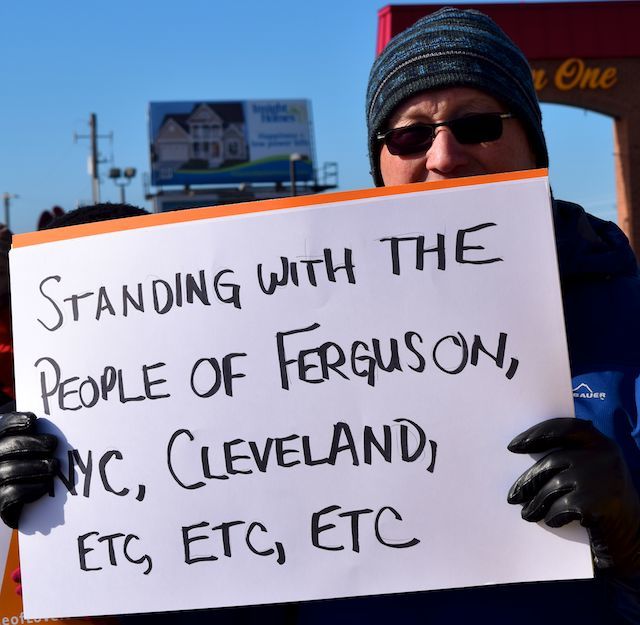 The Unitarian Universalists of Southern Delaware, a congregation located in Lewes, held a healing circle Dec. 7 followed by a peaceful march to Route 1 and Marsh Road where they stood on the side of love to show support for the strife-torn communities of Ferguson, Staten Island, and Cleveland, and affirm the message that black lives matter. Undaunted by the cold and wind, the group stood by the highway with their placards for almost an hour before marching back to UUSD.