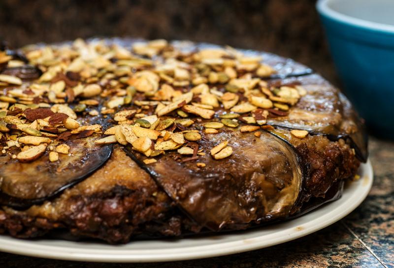 Dahlias from Tuckey’s Farm decorated the table, and glasses were filled with cucumber-rosemary flavored water. Vansant welcomed guests with a savory, spicy root ceviche followed by her roasted sunflower apple salad, and was quick to point out the many benefits of radishes, including being a good source of vitamin C, folate, fiber and potassium. The main course was an Armenian layered eggplant cake, consisting of roasted eggplant, lentils, mushrooms, peppers and turmeric jasmine rice, was delicious as well as beautiful, said Cindy Wanapom, who said she’s been experimenting with vegan dishes since joining VegRehoboth.