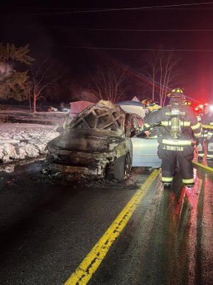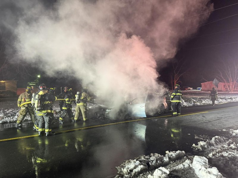The fire was reported at 6:42 p.m. between William Street Road and Carlos Lane, officials said, and when firefighters with the Indian River Volunteer Fire Company arrived, the vehicle was fully involved in flames.