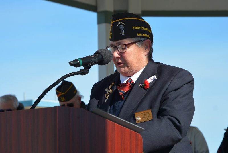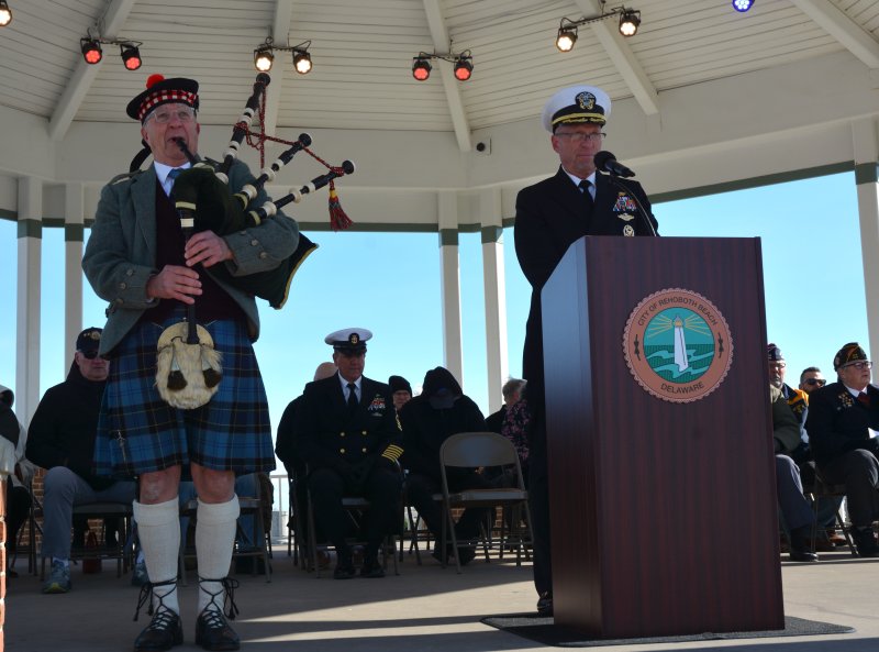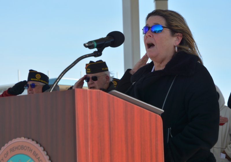 Capt. Dave Diefenderfer, VFW Post 7447 commander and officer in the Navy Reserves, emceed the ceremony, which he tried to keep as short as possible because of the cold and wind. The event featured an invocation and benediction by VFW Post 7447 Chaplain Dawn Drzewicki, a brief welcome by Mayor Stan Mills, and the singing of the national anthem and “God Bless America” by Cape Henlopen Elks Lodge 2540 trustee Joy Schreck.