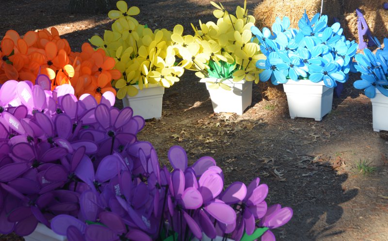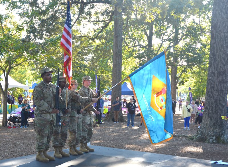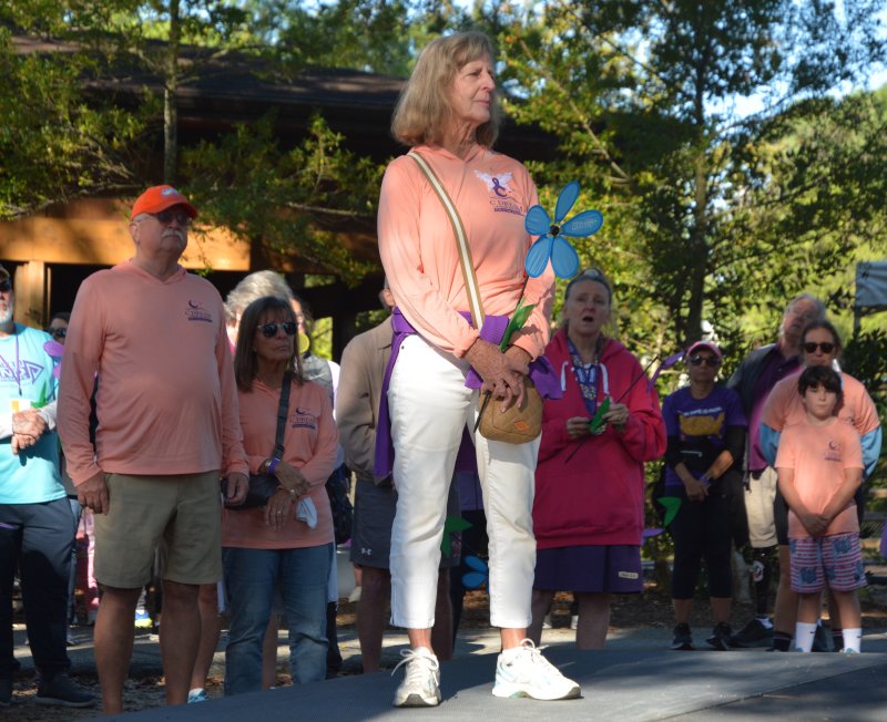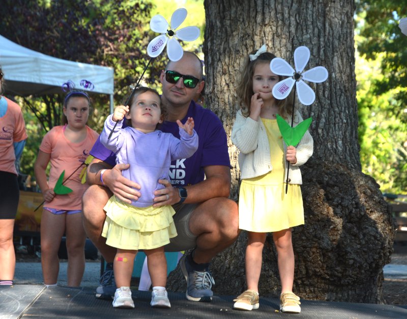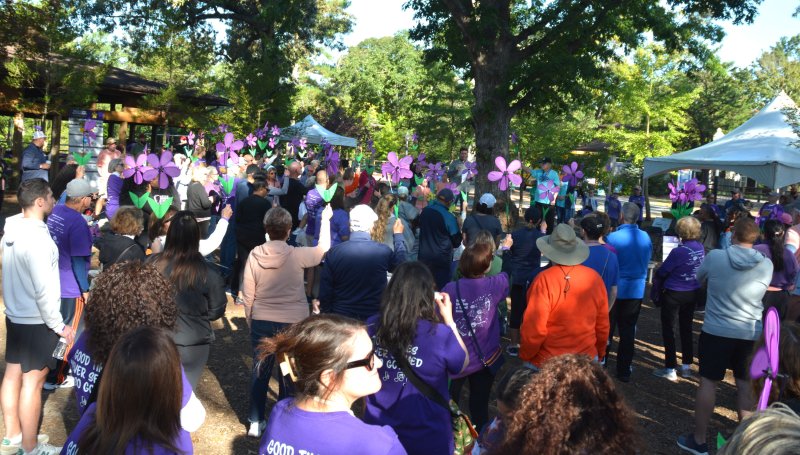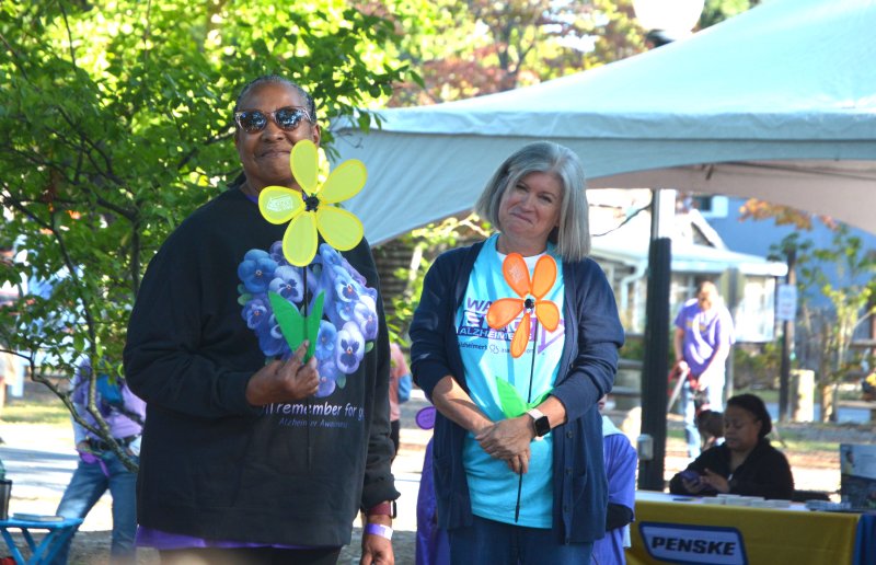 Prior to the walk, organizers held the Promise Garden Ceremony, which recognizes people with the disease and the people who support them. As part of the ceremony, participants received a flower that best represented their connection to the disease – a blue flower represents someone living with Alzheimer's or another dementia; purple is for those who have lost someone to the disease; yellow represents someone who is currently supporting or caring for a person living with Alzheimer's; orange is for those who support the cause and the association's vision of a world without Alzheimer's and all other dementia.