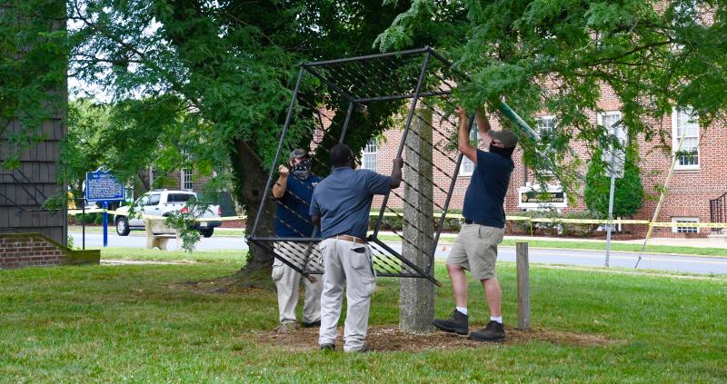 A large crowd cheered as a work crew lifted a whipping post from the ground July 1 near the old Sussex County Courthouse in Georgetown.