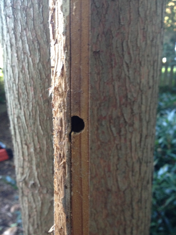 The interesting thing is that these bees bored right on the seam where two boards joined, so we could get a look at their interior handiwork as if looking at two mirrored halves.
