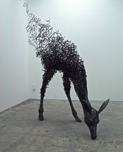 I just realized—this may be why I am so enamored of the work of the young Japanese sculptor Tomohiro Inaba. Why I go back and look at his fascinating creations again and again, finding them dynamic and new with each viewing. To the unfamiliar, Inaba makes iron sculptures, many of them animals, with a twist: each one progresses from a tightly crafted likeness, to metal squiggles that seem to fade away into space. I am positive that Inaba works diligently and at length on these masterpieces, but to me their charm is their impression of an energetic first draft. A precisely-rendered head of a deer, followed by a body that isn’t a body at all, but random wiggly metal lines. It’s as if Inaba gets to a certain point, and then says, “and so forth and so on,” leaving the viewer to fill in the blanks. Yes! My kind of creator!
