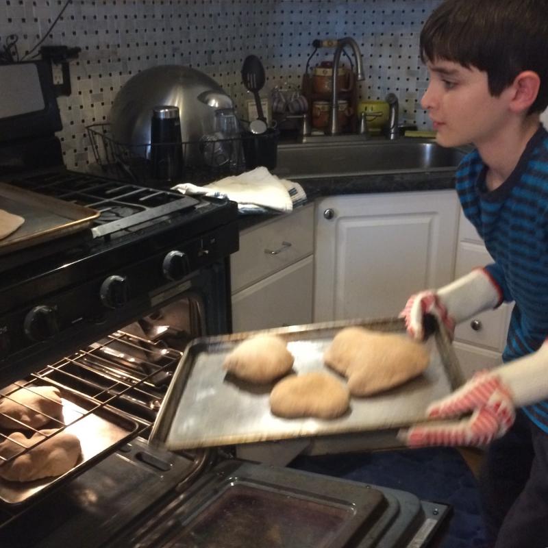 My grandson Jacob makes magic in the kitchen! He fills his house with the sensational aroma of fresh baked bread and the bellies of his whole family with the most delicious whole grain oil free pita! This 11 year old whiz kid uses the precision of his Brown Belt Karate training and the strength of his Parkour performance practice to mix, roll, pat and bake the best batch of pita this side of the Mississippi! Can’t wait for a personal demo (baking, not Karate) in my own home kitchen.