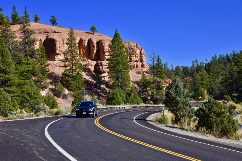 The westward climb from Torrey starts with a ride through farmland before reaching Dixie National Forest where cattle roam freely – crossing the road as well. As you pass meadows and groves of aspen and pine, you reach the summit at 9,800 feet. The middle of the route traverses Grand Staircase-Escalante, one of the most formidable landscapes in the region. The final section of the roadway passes though Red Canyon where hoodoos, or red-rock spirals, dominate the landscape.