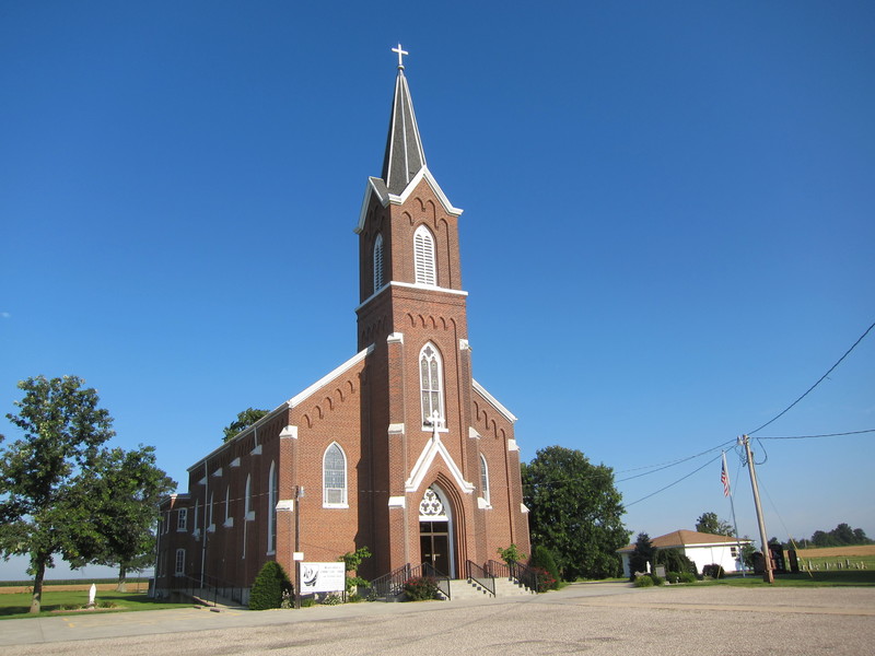 Before we visited the Lincoln site we passed through rich agricultural lands with tall corn and thick carpets of beans. Out in the middle of nowhere we came across a tall-steepled Catholic church. No town nearby. Where did the money come from to build and maintain such a church near the little crossroads called Lillyville?