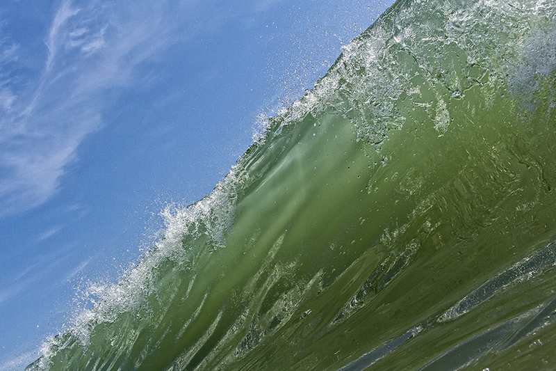 Sometimes, to photograph the precise thing one wants to isolates, it takes a little extra effort and even exposure to discomfort. I shot the lip of a wave today as it curled over me and I got the precise moment of break. No damage done to me or waterproof camera. I love the splash and the beautiful color of this morning, backlit wave.