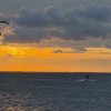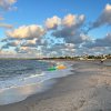 A kiteboarder carves across the water off Cape Henlopen State Park, with the iconic Delaware...