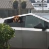 A dog sticks its head out of a Tesla Cybertruck to get a look at the waves in Rehoboth Beach during...
