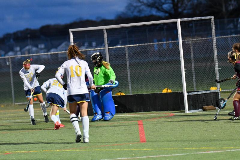 The ball was dropped, and it was game on, no mercy, take no prisoners. Milford was outgunned, but goalie Madeline Sekcinski – her dad Frank a football and basketball player from the Class of ’88 – charged from her cage to make saves, accruing 12 for the game, which included 18 shots and 17 penalty corners.