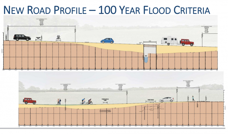 The plan is to build the new bridge and roadway to the 100-year flood elevation, meaning the new bridge will be 7.2 feet higher than it is today. The road surface from Schaffer Lane to Captains Circle will also be raised to the 100-year flood level.