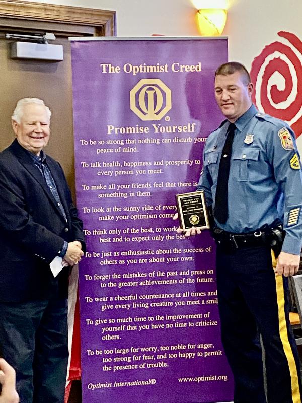The Optimist Club of Sussex County recognized the dedication of Detective Jeff Hudson with its Respect for Law Award at its general meeting May 2.