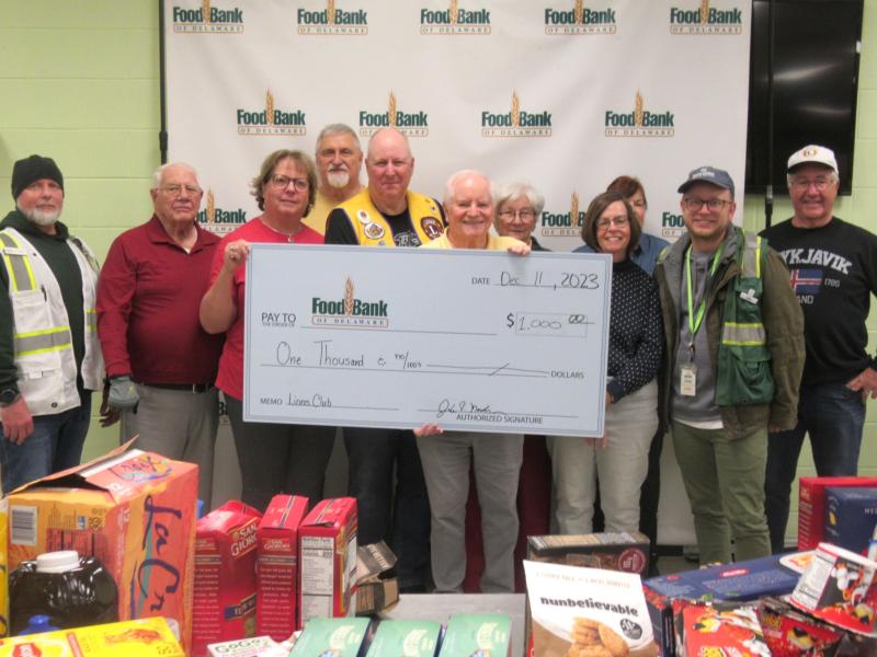 During the final December work shift, Lord Baltimore Lions volunteers took a few minutes to present a club donation in support of the lifesaving Food Bank of Delaware programs. President Scott Brannan presented the donation to Food Bank officials John Snarsky, Milford branch operations director, and Aaron Stone, volunteer coordinator.