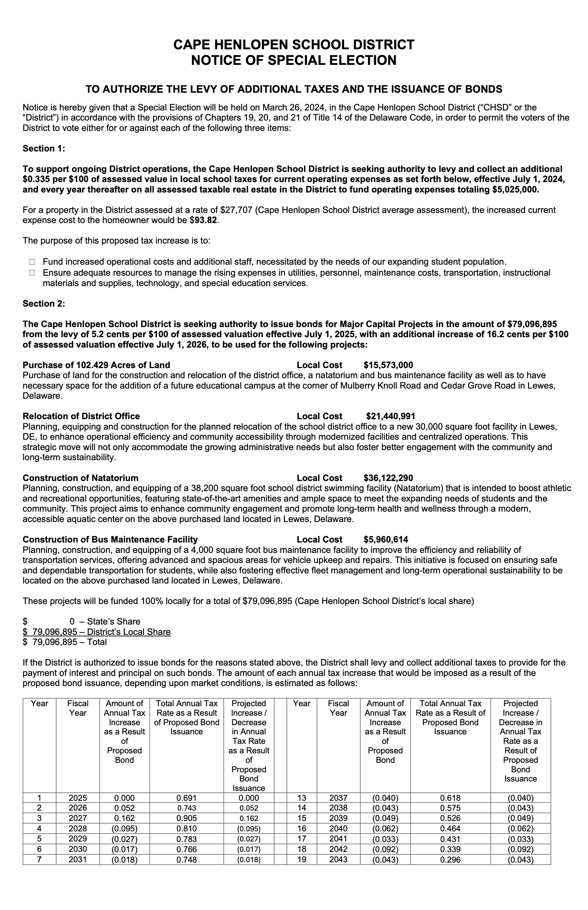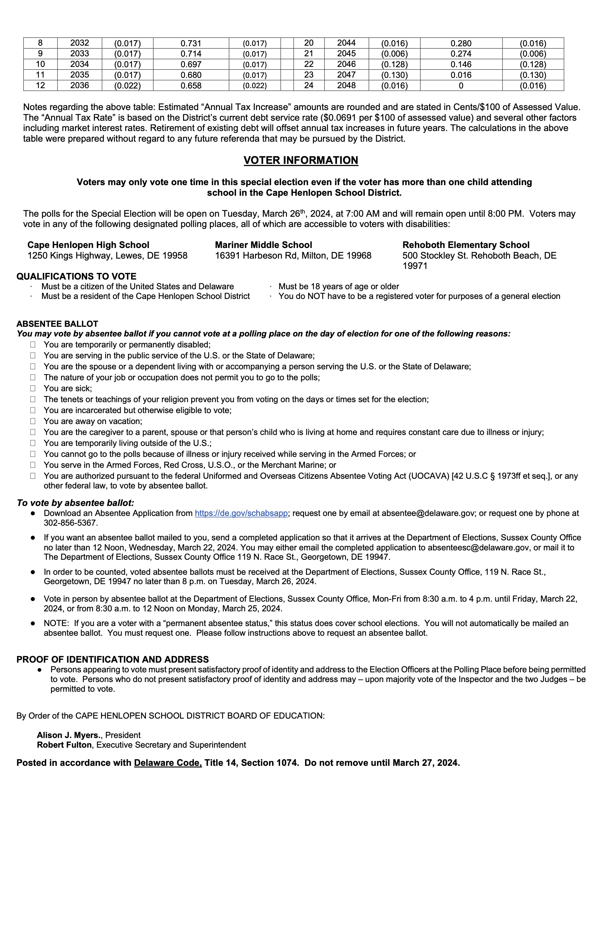 The following public notice is an update to the Cape Henlopen School District Notice of Special Election appearing in the March 1, 2024 edition of the Cape Gazette. The full notice in the below form will appear again in March 5 edition of the Cape Gazette.
