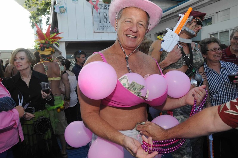 The third annual Bras for a Cause event was held June 6 at Aqua Grill in Rehoboth Beach. It was a fundraiser benefiting the Sussex Chapter of the Women’s Council of Realtors and the Delaware Breast Cancer Coalition. Local businesses sponsored individual bra themes that were modeled by Cape Region men. After tip colletion and a bra parade, the bras were sold in an auction with prices reaching $3,000. Shown with strings of pink beads is Kenny Bukowski in his Beebs for Boobs-themed bra sponsored by Ken Bukowski Quality Home Inspection.