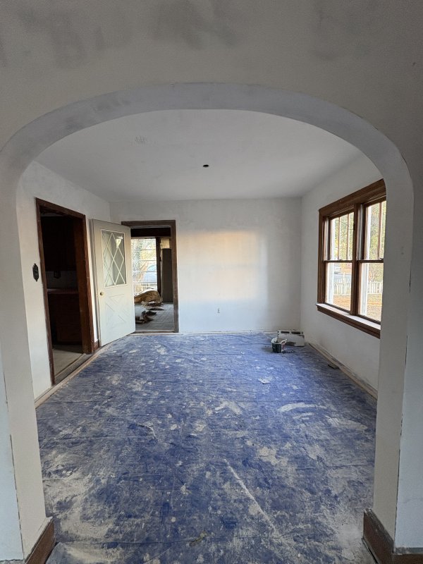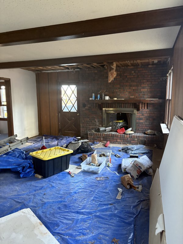 Inside, the traditional layout includes three bedrooms and one-and-a-half bathrooms, offering a solid foundation for renovation. Original woodwork and hardwood floors await refinishing, while the charming brick fireplace holds the potential to become a true focal point once restored.