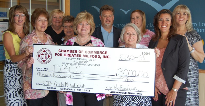 On hand for the presentation of a $3,000 check to the Delaware Breast Cancer Coalition were Chamber of Commerce of Greater Milford's Girls' Night Out Chair Debbie Jewell from corporate sponsor Sussex County Federal Credit Union; CCGM Girls' Night Out committee members Luanne Holland, Ruth Abbate and Sylvia Henderson; CCGM Executive Director Jo Schmeiser; CCGM Administrative Assistant Laurie Judd; and Milford’s 2013 Marvelous Man, Pete Renzi from corporate sponsor I.G. Burton along with Delaware Breast Cancer Coalition Executive Director Vickie Cooke, Program Manager for Education & Survivorship Connie Holdridge and Outreach Coordinator Sue Ryan. Funds represented a portion of the proceeds from the Second Annual Girls' Night Out.