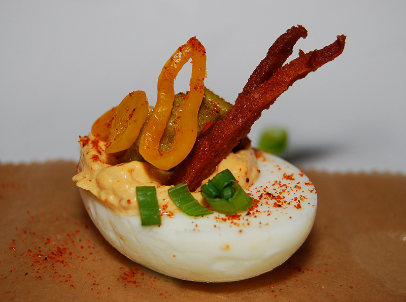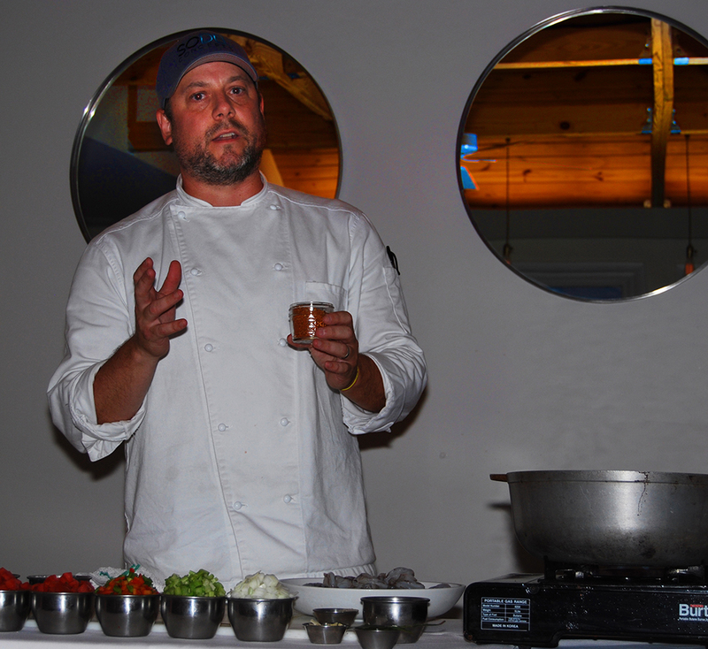 The theme of this program was Cajun/Creole cooking, so Ronnie kicked things off by making pickled okra, mixing, spicing and cooking the brine right before our very eyes. Wow it smelled good! And it tasted even better perched atop an extravagant deviled egg adorned with shaved Andouille sausage, a roasted pepper ring and Cajun seasoning. The humble egg never had it so good.