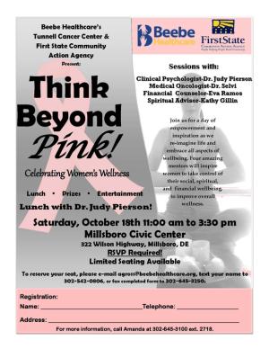 Think Beyond Pink will be held at the Millsboro Civic Center, 322 Wilson Highway, Millsboro. There is no cost for this event, but limited seating is available so participants must RSVP to Amanda Gross via email to agross@beebehealthcare.org or telephone at (302) 645-3100, ext. 2718.