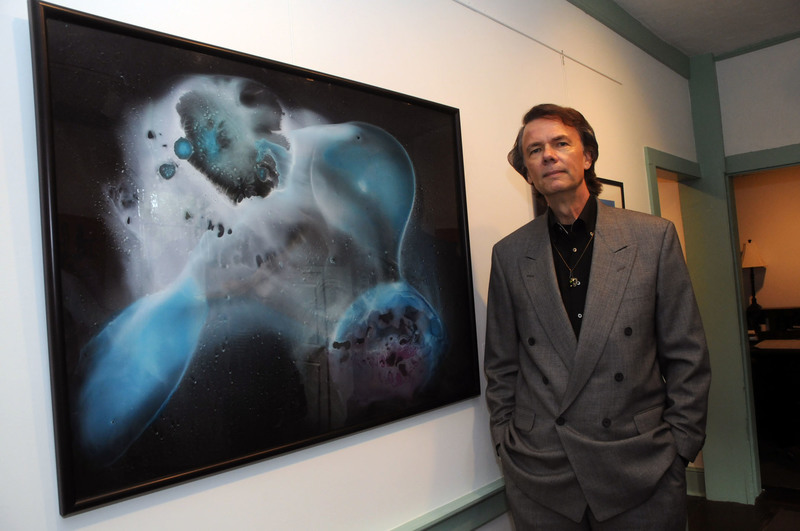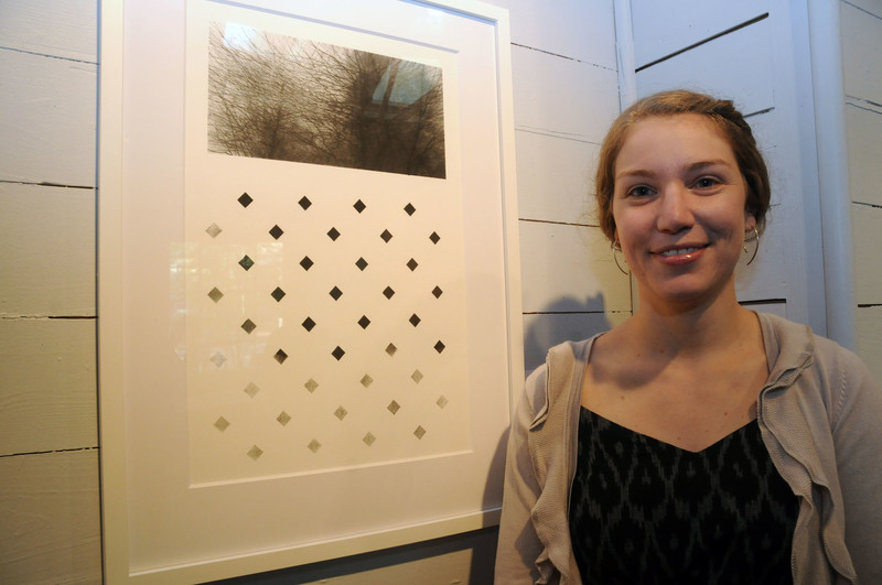 Alice Valenti stands with her graphite on charcoal paper image titled "Tree over Trellis." Valenti said, "I like to imagine that these images could be a backdrop for some elusive narrative. They might be settings for unwritten fairy tales or ghost stories. Or, alternatively these pictures might represent locations beyond the boundary of any story, outside the realm of descriptive accountability." BY STEVEN BILLUPS