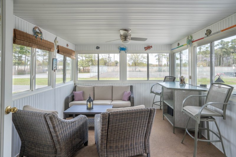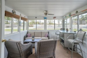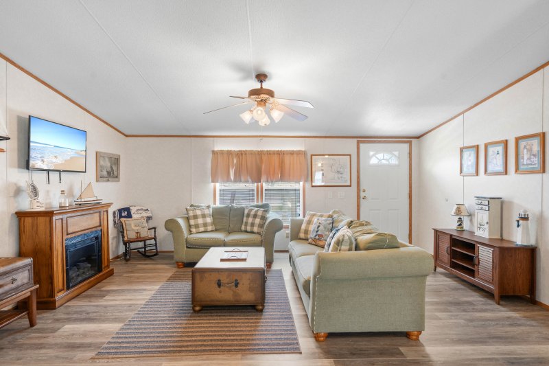 Outdoor amenities include a storage shed with ample space for a golf cart and beach toys, an outdoor shower off the the rear entrance, and front deck with access to the three season porch—perfect for embracing the coastal lifestyle. Walk in to an open-concept floor plan inviting in natural light throughout the home. This home includes three bedrooms, with a spacious primary and attached primary bathroom. Two additional bedrooms and another full bath on the opposite side of the home from the primary provide privacy and flexibility for guests, family members, or the perfect home office setup.