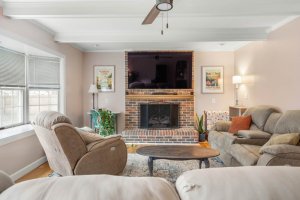 Hardwood floors, ceramic tile, luxury vinyl plank, and carpet give each space its own feel — anchored by a living room with a gas fireplace and an oversized dining room built for real entertaining.
