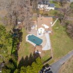 The renovated in-ground pool — new vinyl liner, variable speed pump, and filters updated in 2024 — sits center stage on a brand-new deck completed in 2026, with a pool house and half bath rounding out the experience.