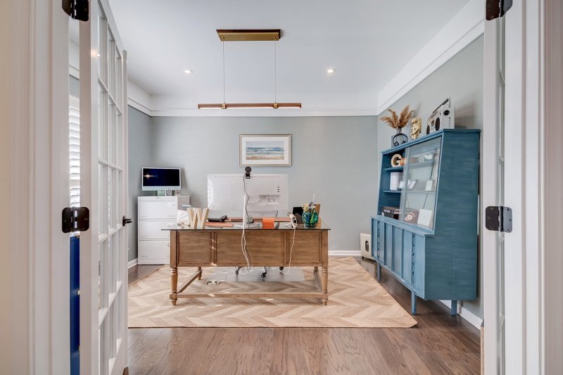 A front room with French doors offers ideal flexibility as a bedroom, office, or creative space.