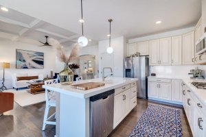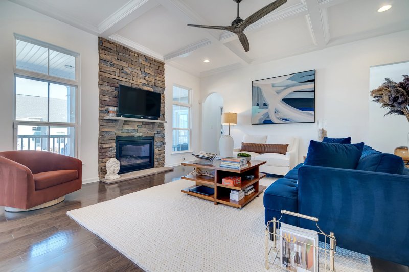 A spacious living area features a coffered ceiling and a gas fireplace with stone surround—cozy and elevated.