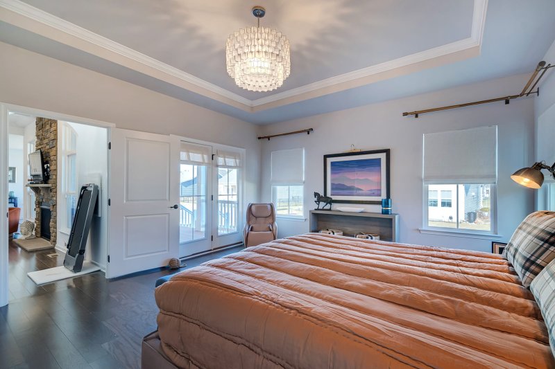 The private primary suite includes a tray ceiling, chandelier, walk-in closet, and direct porch access.