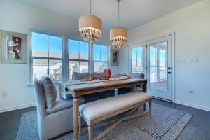 Specialty lighting highlights the dining area, which opens directly to the covered back porch.