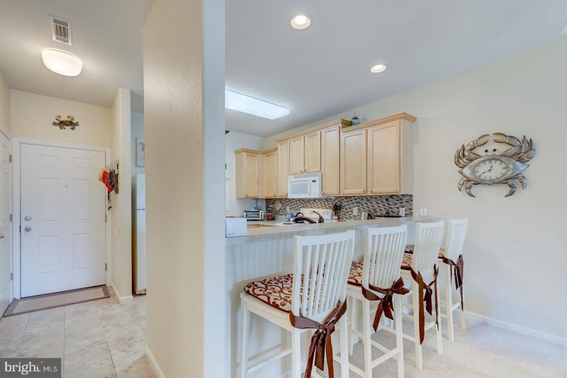 The kitchen features generous cabinetry, a tile backsplash, and counter seating that connects easily to the dining area for relaxed meals or entertaining.