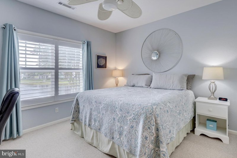 The primary suite includes an ensuite bath, ceiling fan, and plantation shutters for a peaceful retreat. A second bedroom offers flexibility for guests or a home office.