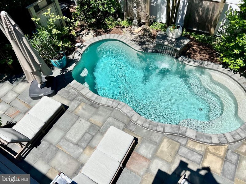 Saltwater pool and separate hot tub framed by manicured landscaping, creating a serene, resort-like backdrop for daily living.