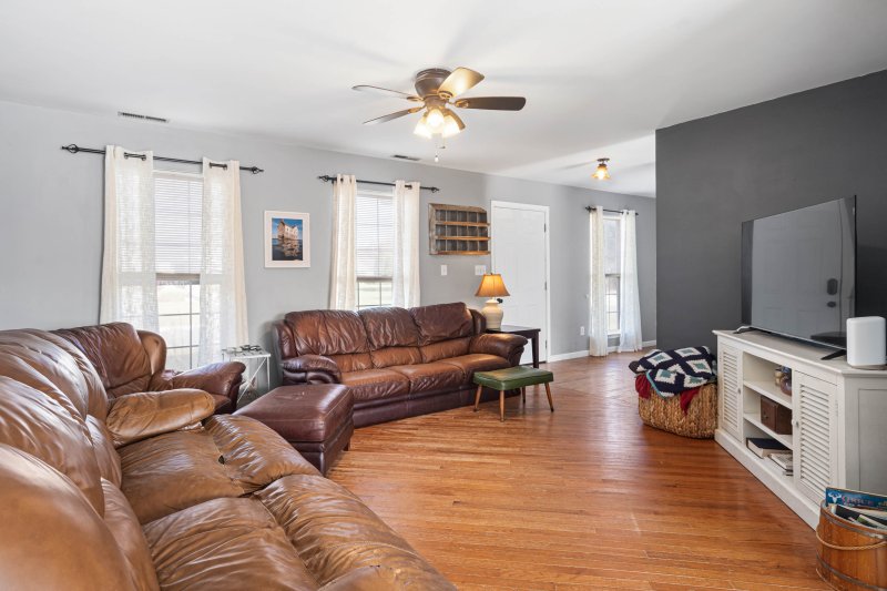 Hardwood floors and a comfortable footprint make the living room an inviting space to relax or host.