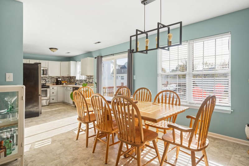 A specialty light fixture highlights the dining area and keeps the main level feeling warm and connected.