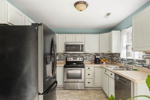 Stainless steel appliances, double sinks, tile backsplash, ample cabinetry, and new flooring give the kitchen both style and function.