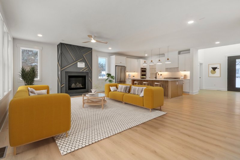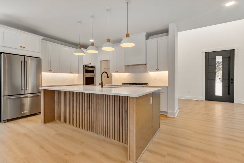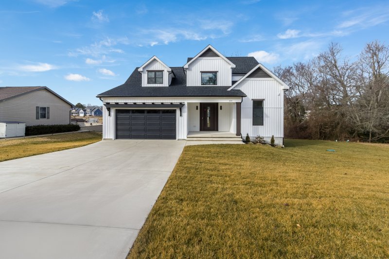 438 Delaware Ave, Millsboro, DE 19966 - A brand-new modern farmhouse by highly regarded custom builder WN Builders, Inc., positioned at the mouth of tranquil Betts Pond and less than a mile from downtown Millsboro. Designed for elevated everyday living and effortless entertaining, this light-filled home features soaring ceilings, expansive windows, wide-plank oak LVP flooring, and recessed LED lighting throughout. A dramatic two-story foyer with a six-ring brushed gold chandelier sets the tone, while the private study with 11-foot tray ceiling offers a refined work-from-home space or an elegant dining room. The designer kitchen is the heart of the home, showcasing two-tone cabinetry, a natural wood island with oak-slatted detail and counter-height seating, quartz countertops, custom range hood, herringbone backsplash, a premium KitchenAid appliance suite with 5-burner gas cooktop, and a walk-in pantry. The 24-foot great room centers around a floor-to-ceiling geometric gas fireplace and oversized windows framing wooded and pond views, with sliding doors leading to an expansive rear deck, perfect for entertaining or watching the sunset over the pond. The main-level primary suite offers a spa-style bath and dual walk-in closets. Upstairs, a second primary suite with private bath and walk-in closet provides exceptional flexibility for guests or multigenerational living, along with two additional bedrooms and a hall bath. All bathrooms feature large format tile flooring, Quartz countertops, and tiled shower surrounds. An unfinished bonus space — with HVAC already sized for conditioning — offers future expansion potential for a second living space, fifth bedroom, second office, of home gym. Built well beyond typical new construction, the home includes a poured concrete foundation, 2x6 framing, blown insulation, a conditioned crawl space with concrete slab and drainage system, tankless water heater, smart home pre-wiring, fully sodded lawn with irrigation, public utilities and so much more. Inquire for a comprehensive list of signature features. Minutes from Delaware beaches, shopping, and dining — this home delivers luxury, flexibility, and true construction quality. Call to learn more about this truly special home!