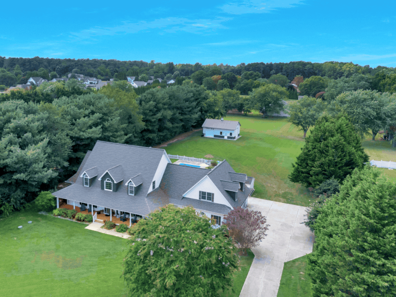 This 4-bedroom, 4.5-bath residence sits on a private 1.87-acre lot and beautifully blends Modern Farmhouse warmth with classic Cape Cod influences. The wraparound porch, gabled dormers, and symmetrical façade nod to timeless farmhouse and coastal traditions, while inside, soaring ceilings, open living spaces, and a flowing floor plan reflect modern design. Step inside to a welcoming foyer with an in-law suite/flex room with private bathroom to the left and a formal dining room to the right. The chef's kitchen--with breakfast nook--opens to a vaulted living room anchored by a pellet stove and a wall of French doors leading to the covered porch, patio, fire pit, and fenced in-ground pool. The first-floor primary suite includes porch access and a spa-like bath with dual vanities, tub, and walk-in shower. Upstairs, find two additional bedrooms with private baths plus two generous attic spaces--one off a bedroom and another off the bonus room--providing excellent opportunities for future expansion. A large mudroom/laundry area offers its own porch entry and connects to the attached 3-car garage, complete with interior stairs to the spacious bonus room. Outside, enjoy a 24x36 conditioned pole building with Cat 6 wiring, plus a shop/shed with electric and heat/air.